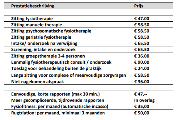 Als er geen vergoeding uit de aanvullende verzekering is, of wij hebben geen contract afgesloten met uw zorgverzekeraar, dan gelden onderstaande praktijktarieven per 01-01-2026.